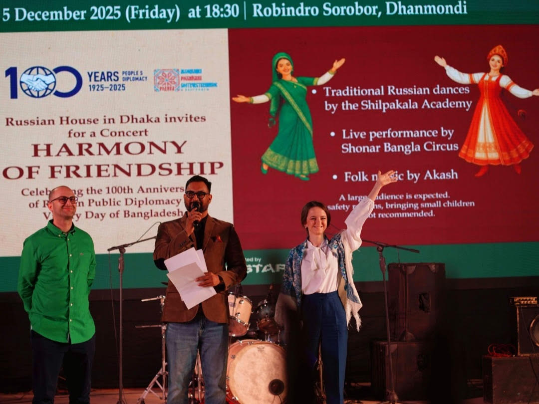 On December 5, 2025, the Russian House in Dhaka organized a large-scale festive concert dedicated to the 100th anniversary of Russian People’s Diplomacy and Bangladesh Victory Day. The event at the open-air stage “Rabindra Sarobar” gathered over 13,000 people.